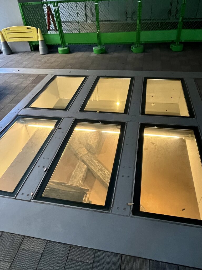 【写真】別館建設時に、牢屋敷にあった上水井戸と上水木樋が出土しました。フェンスで囲まれていましたが、ガラス越しに見ることができました。