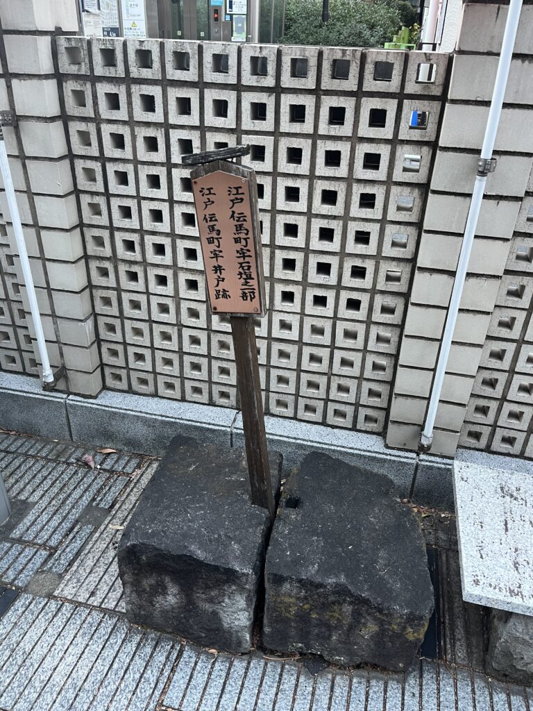 【写真】お寺の境内には「江戸伝馬町牢石垣之一部」「江戸伝馬町牢井戸跡」と書かれた札が立っている石がありました。